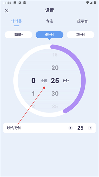 4、在設(shè)置頁面,可設(shè)置計時器時長等參數(shù)。