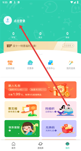 1、進(jìn)入APP首頁,可以選擇點(diǎn)擊右上角領(lǐng)加時(shí)卡和寶箱按鈕,來進(jìn)行領(lǐng)取免費(fèi)游戲的時(shí)長。