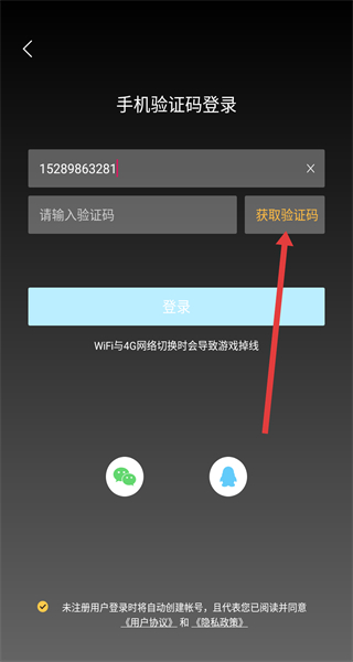 3、在手機(jī)驗(yàn)證碼登錄界面中,填寫好手機(jī)號(hào)后點(diǎn)擊獲取驗(yàn)證碼按鈕,進(jìn)行獲取驗(yàn)證碼。