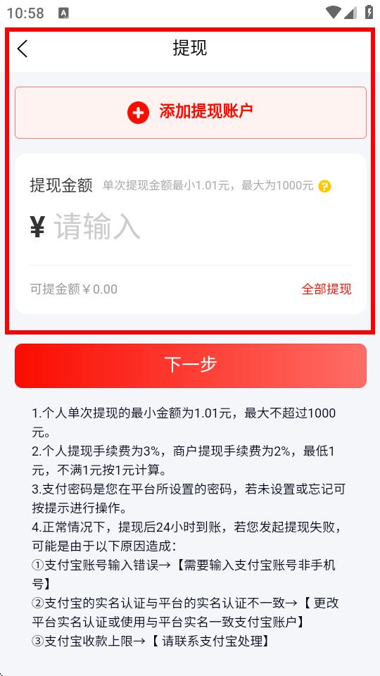 4、在提現(xiàn)頁面,先點(diǎn)擊添加提現(xiàn)賬戶綁定提現(xiàn)賬號,然后輸入提現(xiàn)金額,確認(rèn)信息無誤后點(diǎn)擊下一步,按提示完成提現(xiàn)操作。