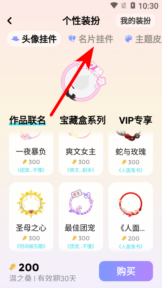 3、在個性裝扮頁面,點擊名片掛件選項,進(jìn)入名片掛件選擇界面。
