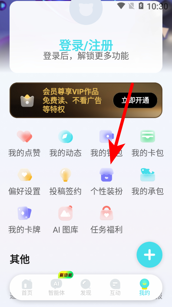 2、在個人中心界面,點擊個性裝扮選項,進(jìn)入個性裝扮頁面。