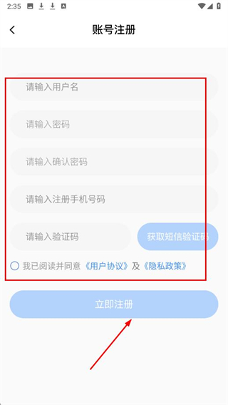 3、注冊完成后,返回登錄頁面,輸入注冊的賬號和設(shè)置的密碼,勾選同意用戶協(xié)議,點擊立即登錄即可。