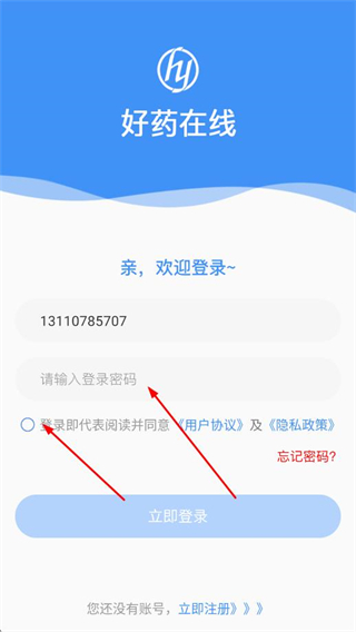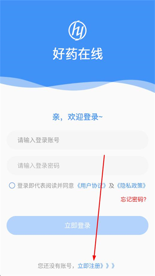 1、打開好藥在線APP,在登錄頁面點擊立即注冊。