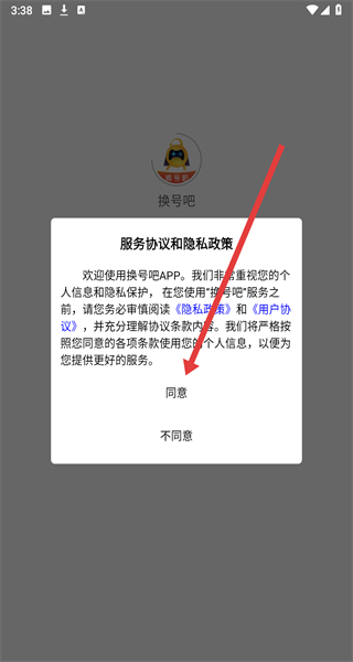 1、在換號吧APP的“服務(wù)協(xié)議和隱私政策”彈窗點擊“同意”,進(jìn)入主界面。