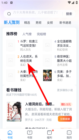1、點(diǎn)擊底部導(dǎo)航欄的書城,進(jìn)入書城頁面,可瀏覽新人駕到板塊下推薦榜的玄幻、同人次元等類型小說,還能參與看書賺錢活動,點(diǎn)擊立即閱讀賺取收益。