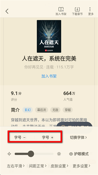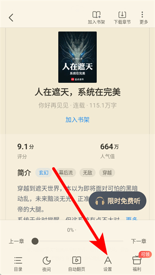 2、在小說詳情界面,點(diǎn)擊下方設(shè)置選項(xiàng),彈出設(shè)置菜單。