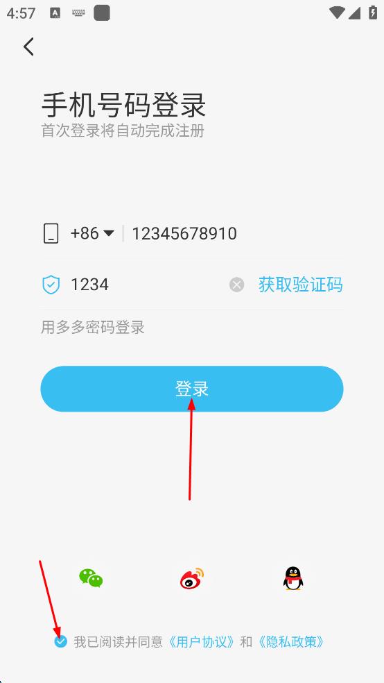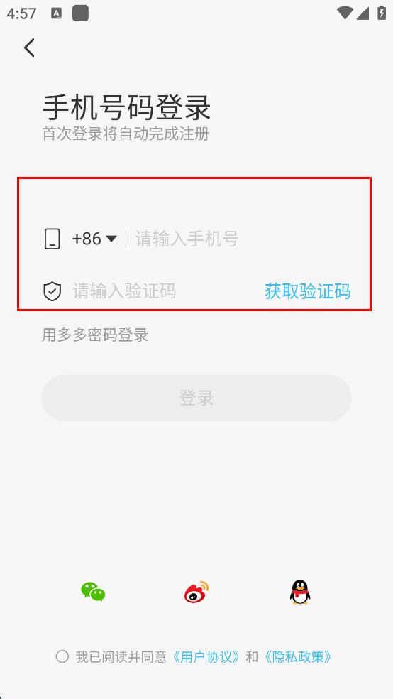 3、輸入手機(jī)號(hào),獲取并輸入驗(yàn)證碼,勾選同意用戶協(xié)議和隱私政策。