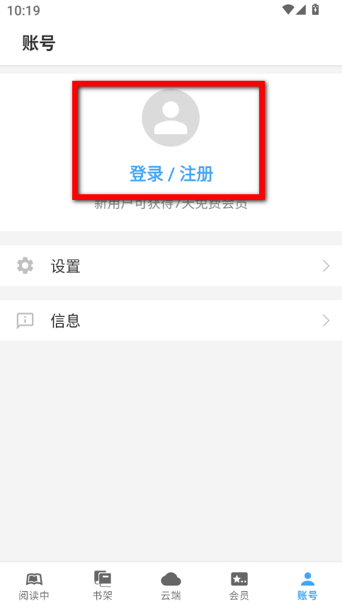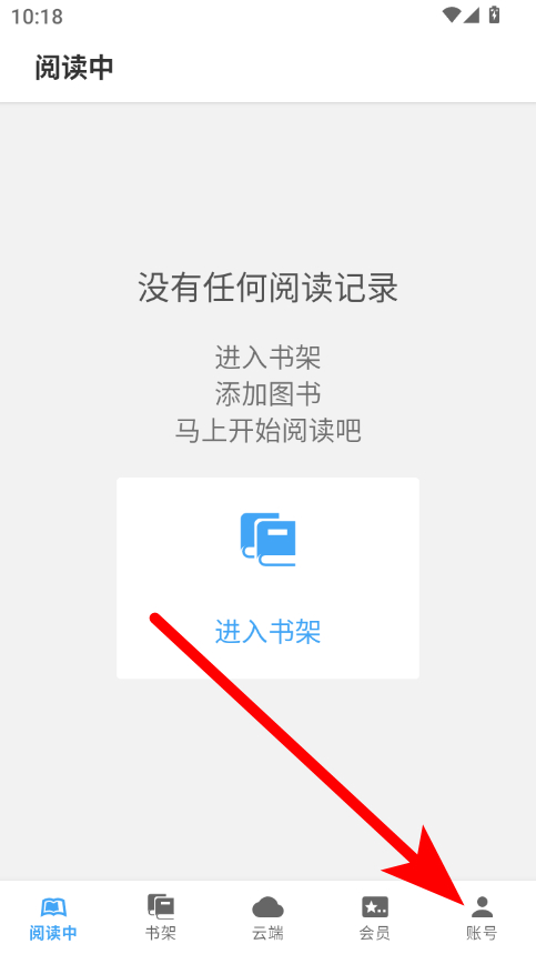 1、在閱讀類APP閱讀中頁面,點(diǎn)擊右下角賬號選項(xiàng),進(jìn)入賬號頁面。
