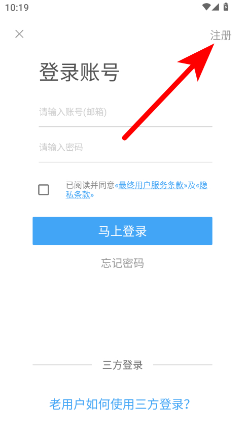 3、在登錄賬號頁面,點(diǎn)擊右上角注冊選項(xiàng),進(jìn)入注冊新賬號頁面。