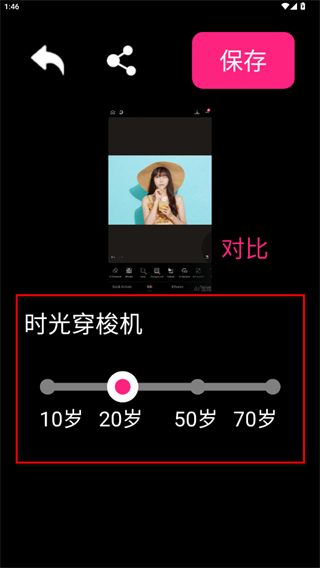 3、進入編輯頁面后,可拖動時光穿梭機的滑塊,選擇10歲、20歲、50歲、70歲等不同年齡效果。