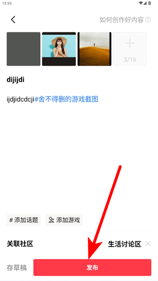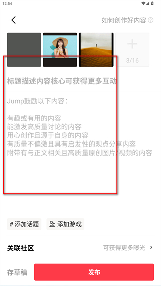 3、進入內(nèi)容編輯頁面,輸入標題和正文內(nèi)容,可添加話題、關(guān)聯(lián)游戲及社區(qū)。