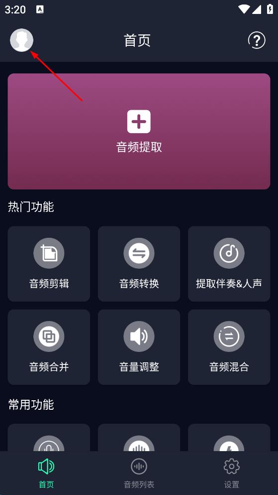 1、打開音頻處理軟件,點擊頁面左上角頭像圖標(biāo)。