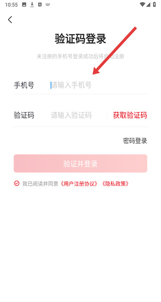 3、在進(jìn)入到登錄頁(yè)面中, 點(diǎn)擊輸入框填寫(xiě)手機(jī)號(hào),以便獲取驗(yàn)證碼進(jìn)行登錄。