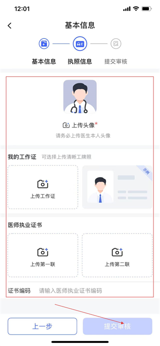 4、上傳頭像、工作證、醫(yī)師執(zhí)業(yè)證書,輸入證書編碼后點擊提交審核,完成賬號注冊。