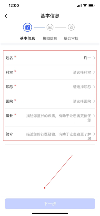 3、在基本信息頁面填寫科室、職稱、醫(yī)院、擅長疾病等信息,點擊下一步。