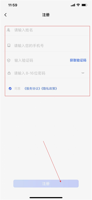 2、在注冊頁面輸入姓名、手機號,填入驗證碼,設置密碼,勾選協(xié)議,點擊注冊。