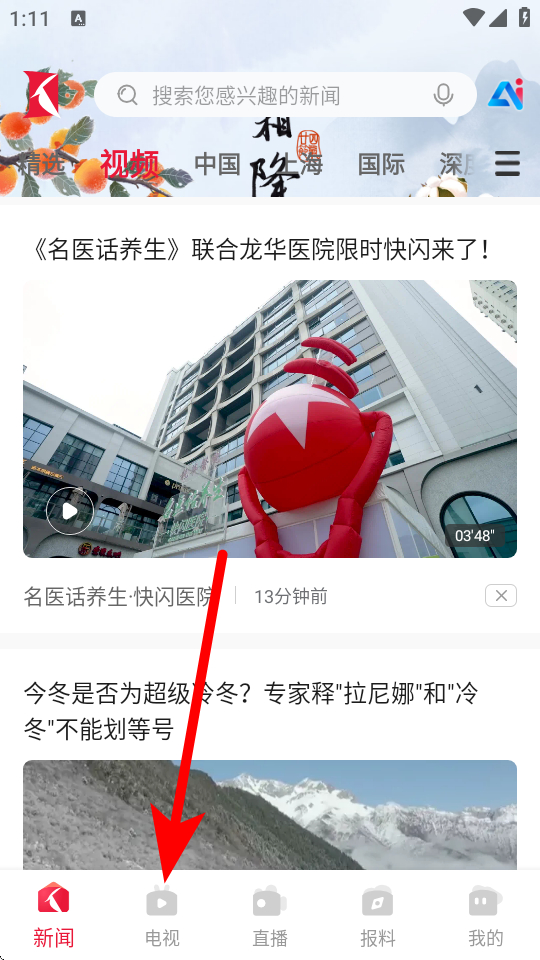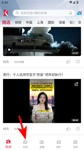 1、在看看新聞app首頁,點(diǎn)擊底部電視選項(xiàng),進(jìn)入電視頁面。