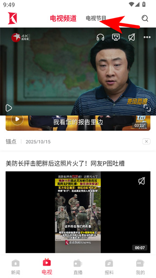 1、在看看新聞app首頁,點(diǎn)擊電視選項(xiàng),進(jìn)入電視頻道頁面。