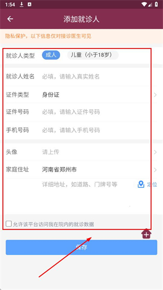 4、選擇就診人類(lèi)型,依次填寫(xiě)信息,勾選允許訪問(wèn),點(diǎn)擊保存。