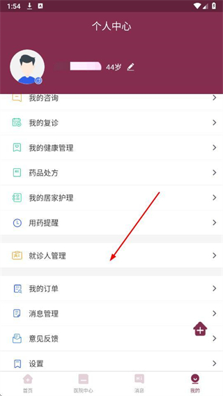 2、在個(gè)人中心頁(yè)面,點(diǎn)擊就診人管理選項(xiàng)。