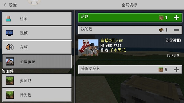 2、進入創(chuàng)建新世界界面,在左下角-附加件-點擊“資源包”、“行為包”,在右邊“我的包”進擊的巨人-分別“激活”資源包與行為包;(若模組未生效,請重復1,2步驟)