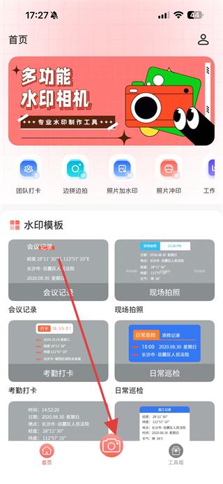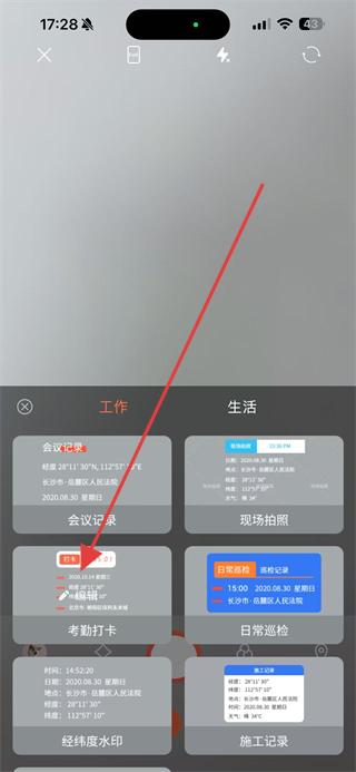 2、在拍攝界面,選擇考勤打卡水印模板并應(yīng)用。