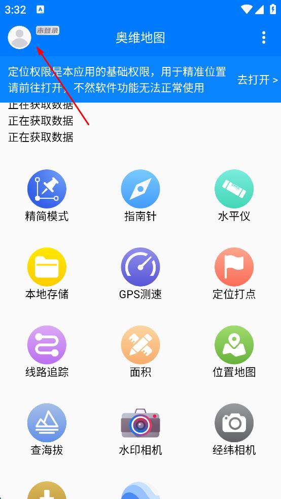 1、打開奧維地圖APP,點(diǎn)擊左上角未登錄頭像。