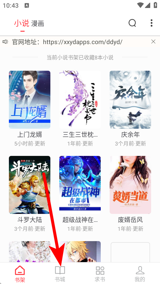 1、在點(diǎn)點(diǎn)閱讀書架頁面,點(diǎn)擊書城選項(xiàng),進(jìn)入書城界面。