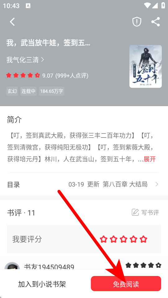 3、在小說詳情頁面,點(diǎn)擊免費(fèi)閱讀按鈕,進(jìn)入小說閱讀界面。
