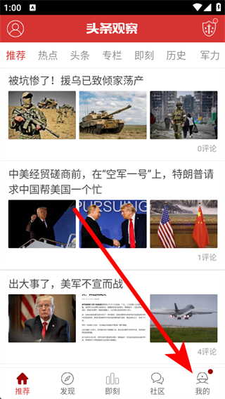 1、打開頭條軍事APP首頁,點擊底部我的,進入個人功能頁面。