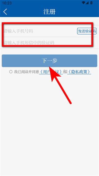 4、輸入手機號碼和驗證碼,勾選同意后,點擊下一步按鈕,即可完成注冊登錄操作。