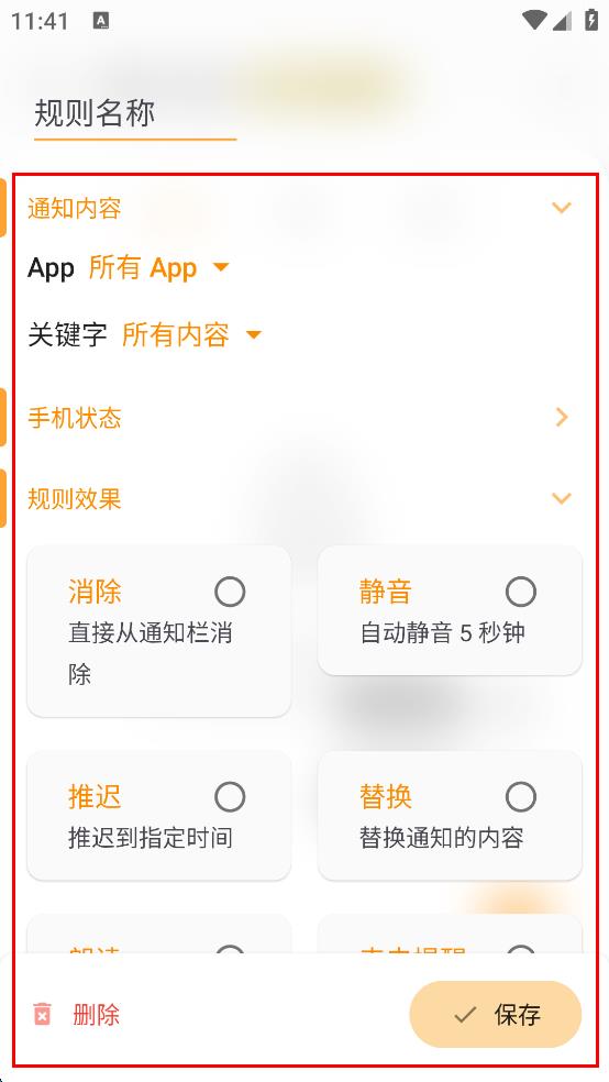 4、設(shè)置規(guī)則名稱、通知內(nèi)容、手機狀態(tài)、規(guī)則效果等,點擊保存即可創(chuàng)建自定義通知規(guī)則。