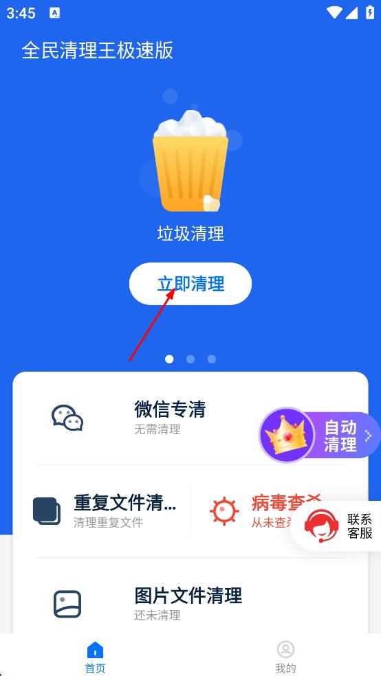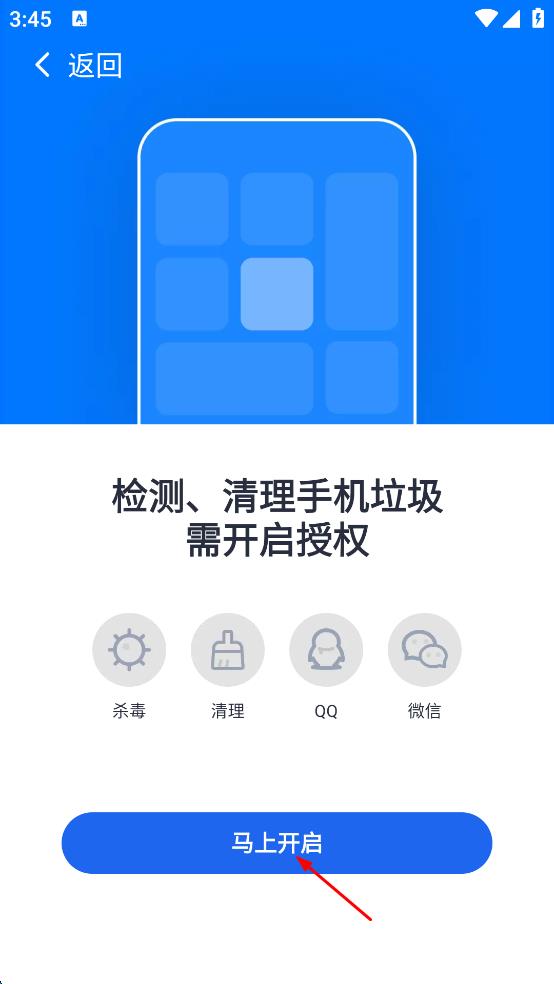 1、打開全民清理王極速版APP,點(diǎn)擊立即清理,進(jìn)入授權(quán)開啟頁面。