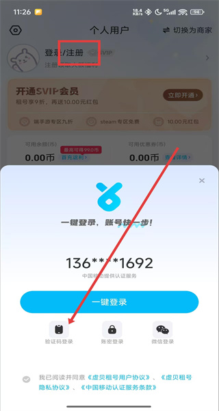 2、在個(gè)人頁面中,點(diǎn)擊登錄/注冊(cè)區(qū)域,彈出登錄方式選擇窗口,選擇驗(yàn)證碼登錄。
