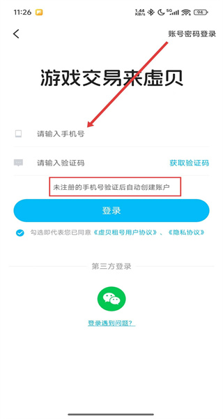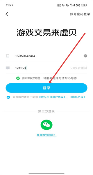 4、把收到的驗(yàn)證碼填入請(qǐng)輸入驗(yàn)證碼輸入框,點(diǎn)擊登錄按鈕,完成虛貝APP的注冊(cè)登錄流程。