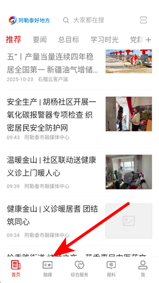 1、打開(kāi)阿勒泰好地方APP,點(diǎn)擊底部融媒,進(jìn)入融媒的頁(yè)面。