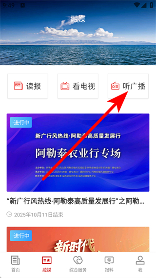2、在融媒的頁(yè)面,我們需要點(diǎn)擊聽(tīng)廣播,進(jìn)入廣播選擇頁(yè)面。
