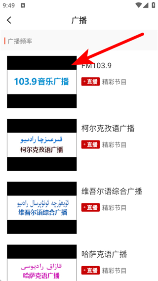 3、在廣播選擇頁(yè)面,選擇想要收聽(tīng)的廣播頻率,點(diǎn)擊進(jìn)入該廣播播放頁(yè)面。
