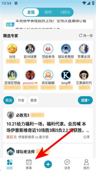 1、在首頁點擊底部賽事,進入賽事頁面,可查看足球等各類賽事實時信息。