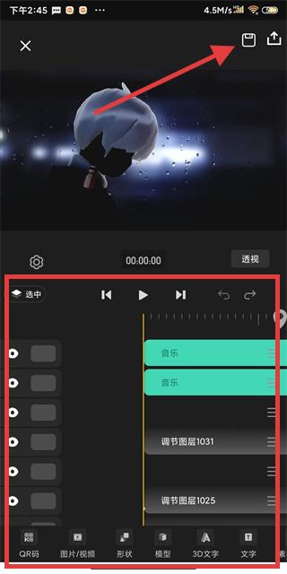 4.進(jìn)入編輯界面后,可對(duì)模板中的圖層、音樂、3D元素等進(jìn)行編輯,編輯完成后點(diǎn)擊右上角的保存或?qū)С霭粹o,即可完成3D魔秀作品的創(chuàng)作。
