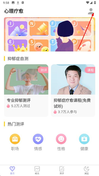 1、打開抑郁癥測試APP,點(diǎn)擊首頁右上角的個人中心圖標(biāo)。