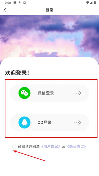 3、勾選用戶協(xié)議,選擇微信登錄或QQ登錄方式,完成登錄操作。