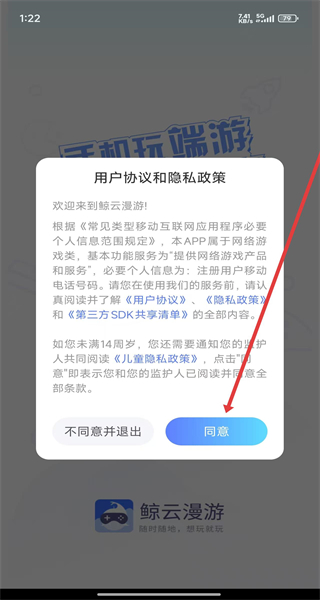1、點擊“用戶協(xié)議和隱私政策”彈窗的“同意”,進(jìn)入鯨云漫游主界面。