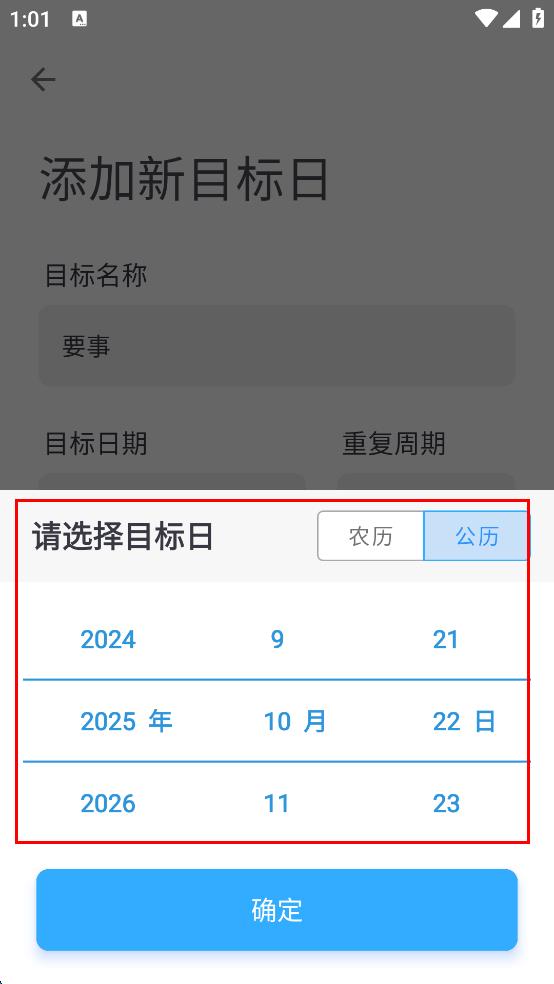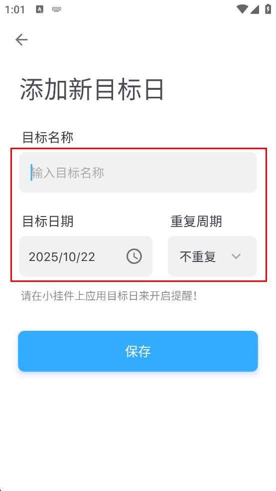 2、在添加新目標日界面輸入目標名稱,選擇目標日期,設(shè)置重復(fù)周期。