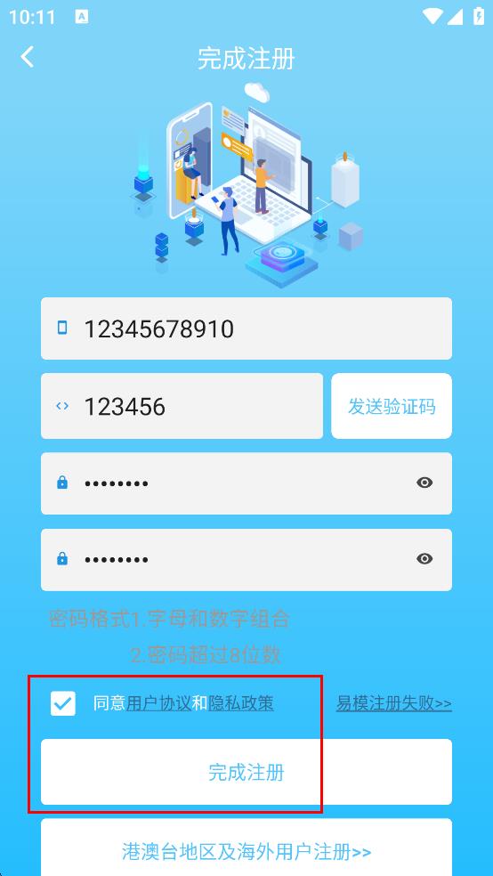 4、勾選同意用戶協(xié)議和隱私政策,點(diǎn)擊完成注冊(cè)即可。