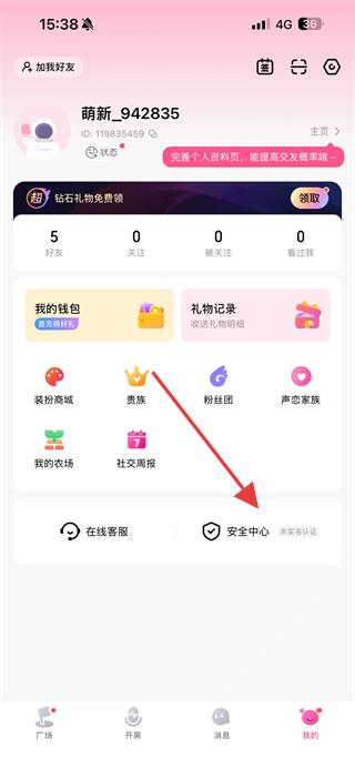 2、在個(gè)人頁(yè)面中,點(diǎn)擊安全中心選項(xiàng)。