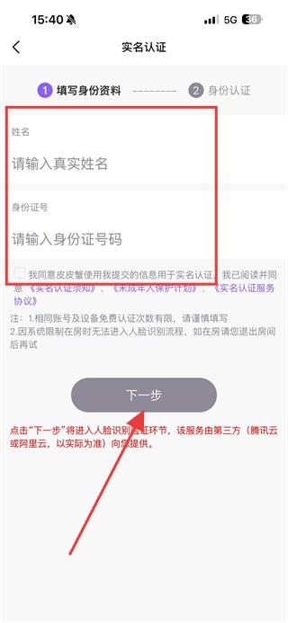 4、在實(shí)名認(rèn)證頁(yè)面,輸入真實(shí)姓名和身份證號(hào),勾選同意協(xié)議后點(diǎn)擊下一步,按照提示完成人臉識(shí)別等操作即可完成實(shí)名認(rèn)證。