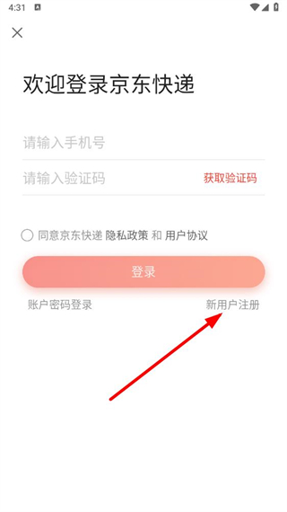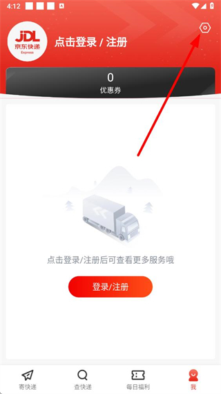 1、在京東快遞app主界面,找到登錄注冊按鈕并點擊,進入登錄注冊頁面。