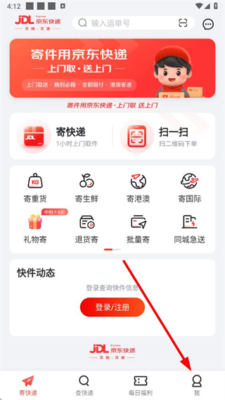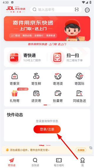 1、在京東快遞官方版,點擊寄快遞,若未登錄會提示需要登錄,點登錄注冊。